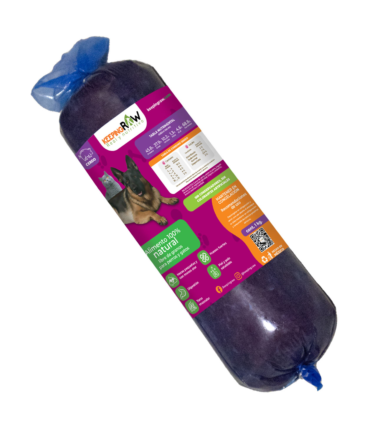 Carne de cerdo, carne de pollo, hígado de res, mix de vegetales (betabel, chayote, calabacita, brócoli, espinaca y acelga).
